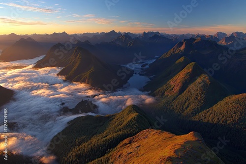 © Zahida, Obraz premium Mountainous landscape at dawn. Misty valley between peaks