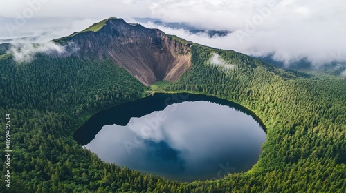 Fototapeta premium Mountainous landscape features a stunning crater lake surrounded by lush forest and misty clouds at dawn