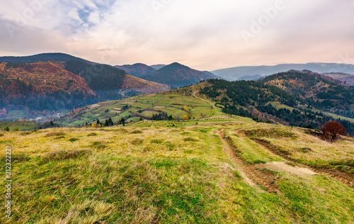 Fototapeta premium mountainous landscape of Mizhhirya district. lovely countryside scenery on a hazy and overcast day. country road down the hill in to the rural area