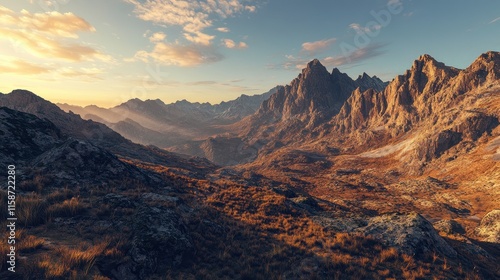 © Agri, Obraz premium Mountainous Landscape with Golden Sunset and Lush Vegetation