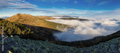 Fototapeta premium Mountainous landscape with hills and valleys at a sunny day in autumn season....