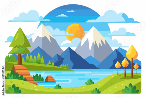 Fototapeta premium Mountainous Landscape with Lake and Sun