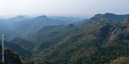 © Thanthara, Fototapeta premium Mountainous landscape with lush greenery and distant peaks