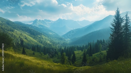 © aulia, Obraz premium Mountainous Landscape with Misty Peaks and Lush Green Slopes