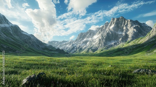 © chesleatsz, Obraz premium Mountainous Landscape with Verdant Valley and Scattered Flowers