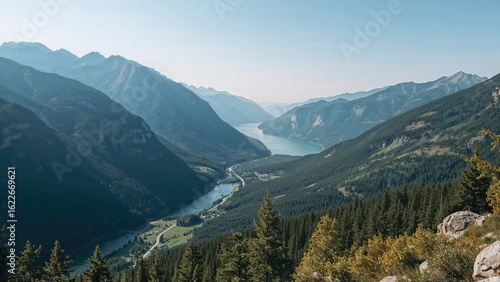 Fototapeta premium Mountainous region with an extensive lake in the foreground