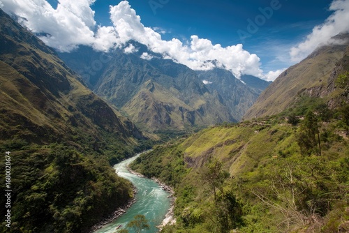 © Rabah, Fototapeta premium Mountainous River Valley Landscape In Green Foliage
