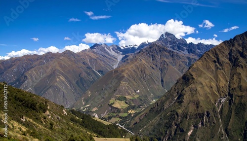 Fototapeta premium Mountainous valley vista under a vibrant blue sky