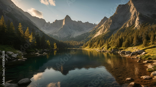 Fototapeta premium Mountains Ablaze: Golden Light and Alpine Reflections