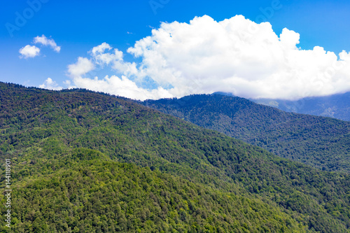 Fototapeta premium Mountains and clouds in a bright blue sky.