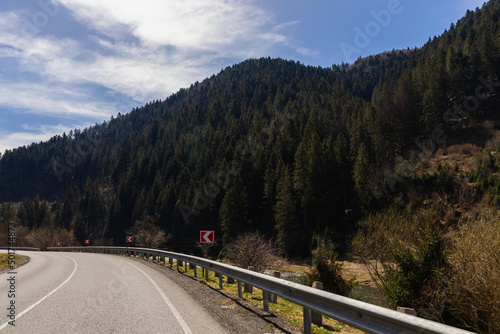 Fototapeta premium Mountains and forest near empty road at daytime.