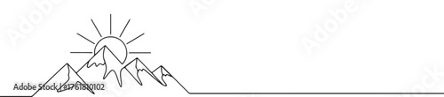 © drawing lines, Fototapeta premium Mountains and sun continuous one line drawing. Hand drawn sunset panoramic view.
