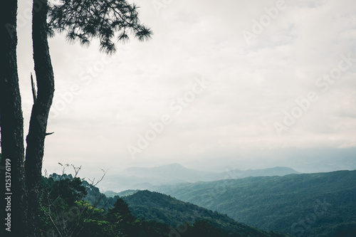 Obraz premium Mountains and tree under mist in the morning. Vintage or retro tone.