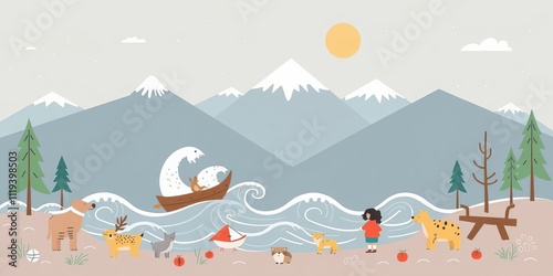 © Chalermrach, Naklejka premium Mountains and waves in a Scandinavian style illustration with playful animals and trees, vector, waves