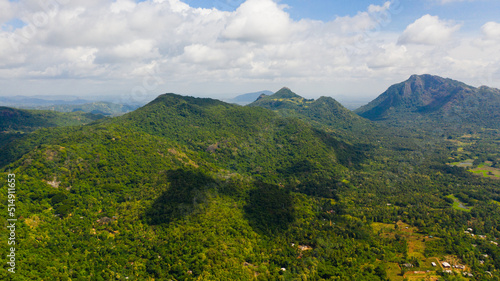 Fototapeta premium Mountains covered rainforest, trees and blue sky with clouds. Sri Lanka.