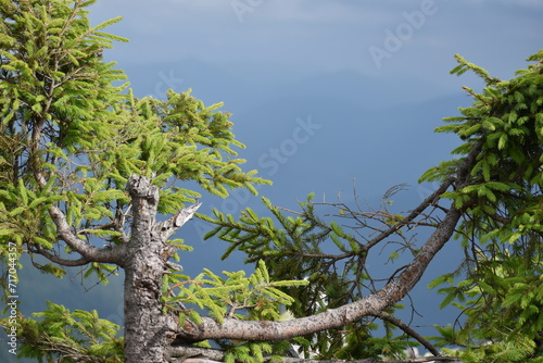 Fototapeta premium mountains, fog, forests, valleys. Carpathians. Mountains covered with forests and various conifers. At the top of the mountain boulders.