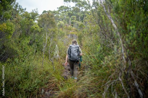 © Phoebe, Naklejka premium mountains in a wilderness in a national park with native plants and trees in a rainforest in Australia, forest growing in a national park in Tasmania. with rivers and exploring