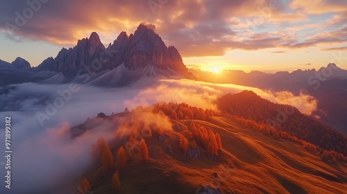 © Generative AI, Fototapeta premium Mountains in low clouds at sunset in autumn in Dolomites Italy Landscape with alpine mountain hills in fog orange trees and grass in fall colorful sky with golden sunbeams Aerial view : Generative AI