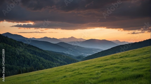 © haiqiang, Obraz premium mountains in the distance with a green field and a few trees
