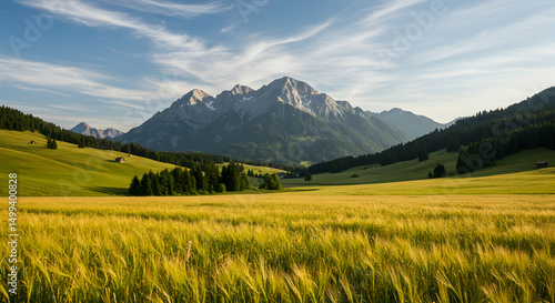 © sarinya, Fototapeta premium Mountains, Mountain range, Alps, Majestic Mountain Landscape with Golden Wheat Field