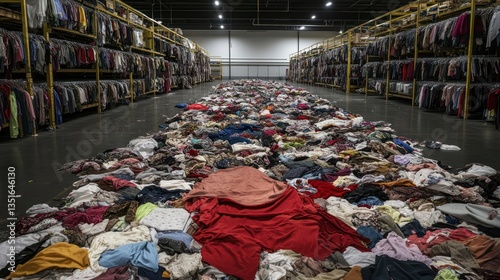 Obraz premium Mountains of discarded clothing in a warehouse, highlighting the massive...