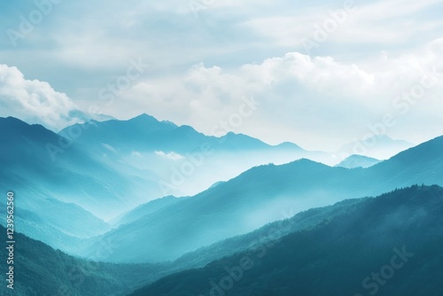 © Anat art, Obraz premium Mountains shrouded in mist with a serene atmosphere in the early morning light over a quiet valley. Generative AI