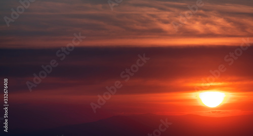 Fototapeta premium Mountains silhouettes, beautiful colorful dark sunset sky with orange clouds....