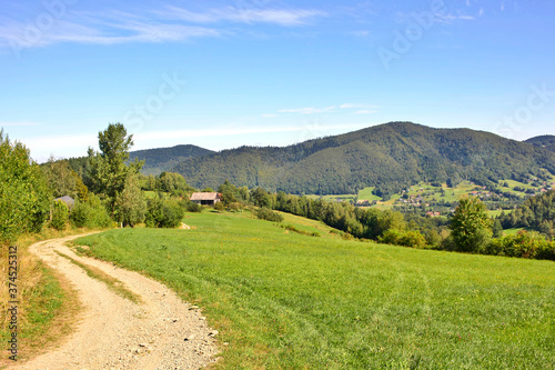 © Jurek Adamski, Fototapeta premium Mountains summer landscape. Dirt road through the green fields and forest on a blue sky with white clouds