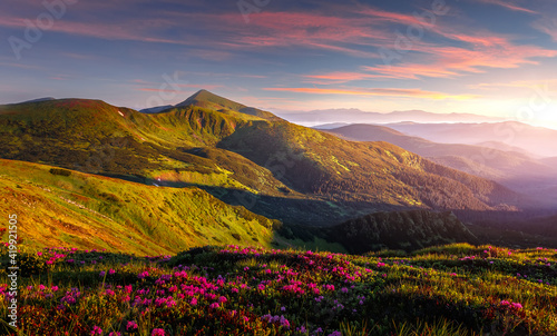 Fototapeta premium Mountains under mist during sunset. Scenic image of fairy-tale Landscape with Pink rhododendron flowers and colorful sky under sunlit, over the Majestic Rocky Peacks. Picture of wild area