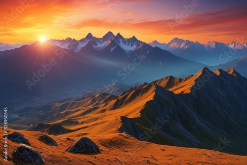 © haiqiang, Naklejka premium mountains with a sunset in the background