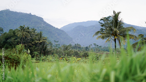 © Rahayu, Fototapeta premium Mountains With Coconut Trees And Grass Bokeh As Foreground