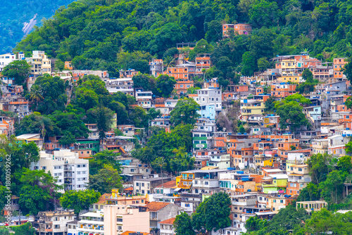 Naklejka premium Mountains with favelas houses tropical nature Rio de Janeiro Brazil.