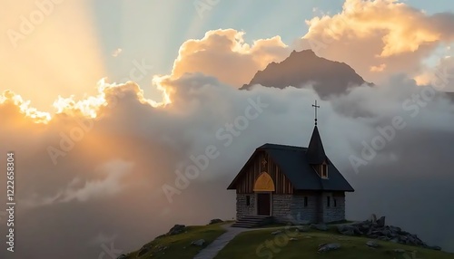 Fototapeta premium Mountaintop Chapel Sunset Cloudscape Scenic View