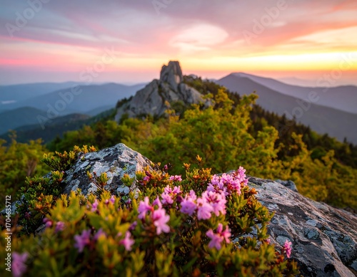 © Paijo, Fototapeta premium Mountaintop flowers at sunrise