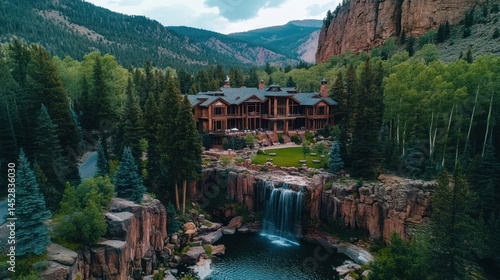 © BABEKU, Naklejka premium Mountaintop Mansion with Waterfall