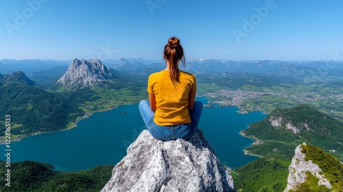 Naklejka premium Mountaintop Serenity: A solitary figure sits in serene meditation atop a rocky mountain peak, overlooking a breathtaking vista of azure waters and verdant valleys, with a backdrop of majestic peaks.