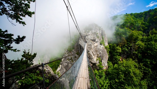 © Ringgo, Obraz premium Mountaintop suspension bridge, fog