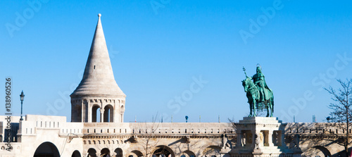 Naklejka premium Mounted statue of Saint Stephen I, aka Szent Istvan kiraly - the first king of Hungary at typical white rounded tower of Fisherman's Bastion in Buda Castle in Budapest, Hungary, Europe. Sunny day shot