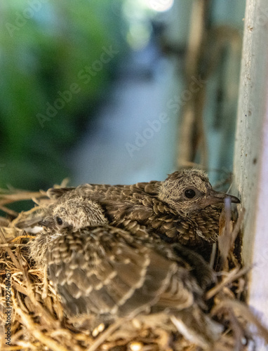 © SailingAway, Fototapeta premium Mourning Dove Zenaida macroura nest with two chicks