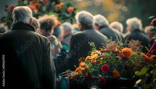 Naklejka premium Mourning people gather around a flower adorned burial urn bidding a sad farewell to the deceased at a memorial service