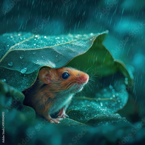 © vlntn, Fototapeta premium Mouse Seeking Shelter Under Leafy Canopy