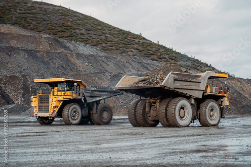 © CjVitoS, Obraz premium Movement of dump trucks at the gold mining site.