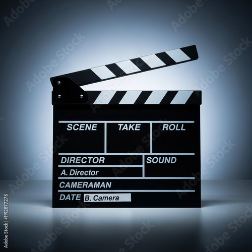 © Cozy Art, Fototapeta premium Movie clapperboard on dark background with spotlight lighting