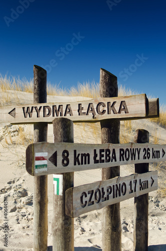 © Dominik Kopycinski, Obraz premium Moving dunes at sunny day, Slowinski National Park, Leba. Sand and blue sky