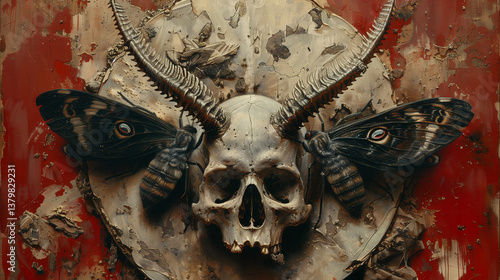 Fototapeta premium Mroczna ilustracja surrealistyczna – czaszka z rogami i skrzydłami ćmy w...