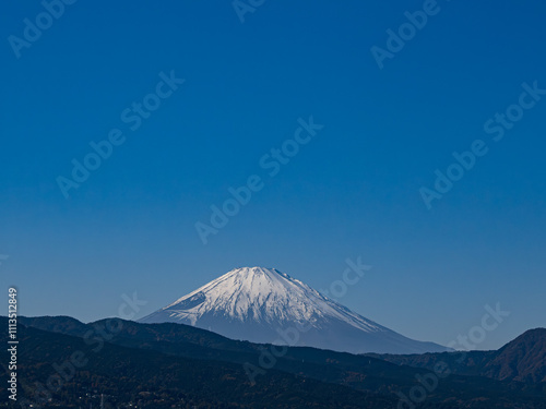 Fototapeta premium 富士山。東側。冬の晴天。山麓は、一度積もった雪が強風で吹き飛ばされた。 神奈川県小田原市内より。 Mt. East side. Clear winter sky. At the foot of the mountain, once accumulated snow was blown away by strong wind. Mt. Fuji. East side.