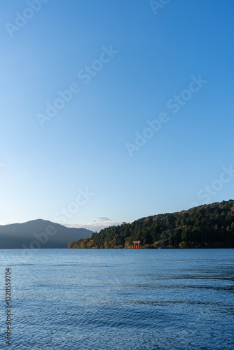 © Jasmien, Fototapeta premium Mt. Fuji and red Torii gate on lake Ashi at Sunset, Hakone, Japan