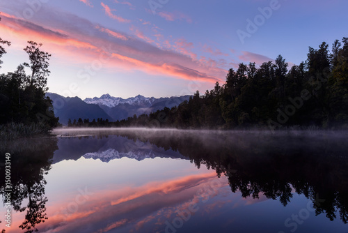 © Janice, Fototapeta premium Mt Tasman and Mt Cook reflected in the clear waters of Lake Matheson at Sunrise. West Coast. South Island. New Zealand.