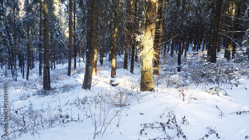 © Iryna, Fototapeta premium Much trees with snow in winter forest. Nature background.