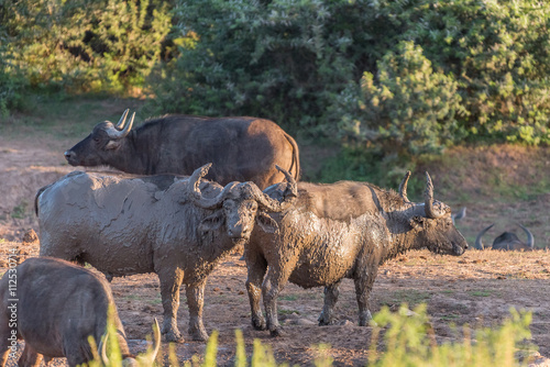 © dpreezg, Obraz premium Mud covered buffaloes at sunset